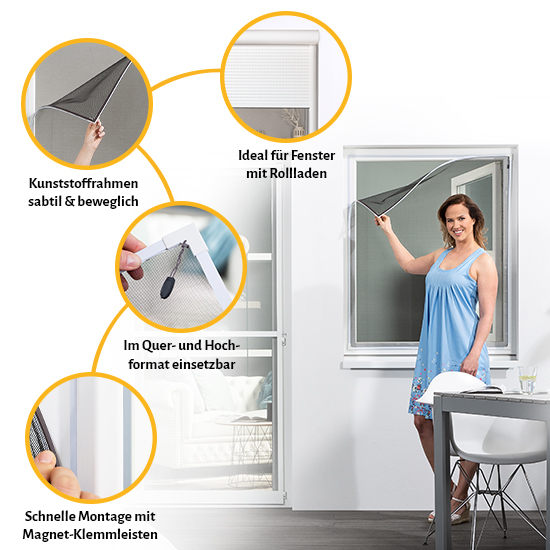 Unser Fliegengitter "EASY" bietet eine clevere Möglichkeit sich vor Insekten zu schützen und ist zudem eine kostengünstige Alternative zu herkömmlichen Spannrahmen. Der flexible Kunststoffrahmen wird mithilfe von selbstklebenden Magnetbändern rund um das Fenster befestigt. Dadurch lässt sich der Rahmen schnell und mühelos anbringen und ebenso leicht wieder abnehmen. Das schwarze Filatec® Gewebe gewährleistet eine hervorragende Luftzirkulation und gleichzeitig eine klare Sicht nach draußen. Die Montage gelingt einfach und in wenigen Schritten.