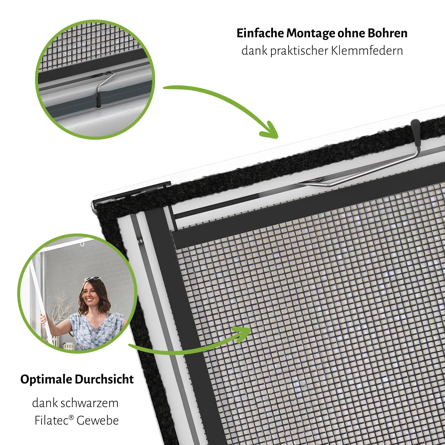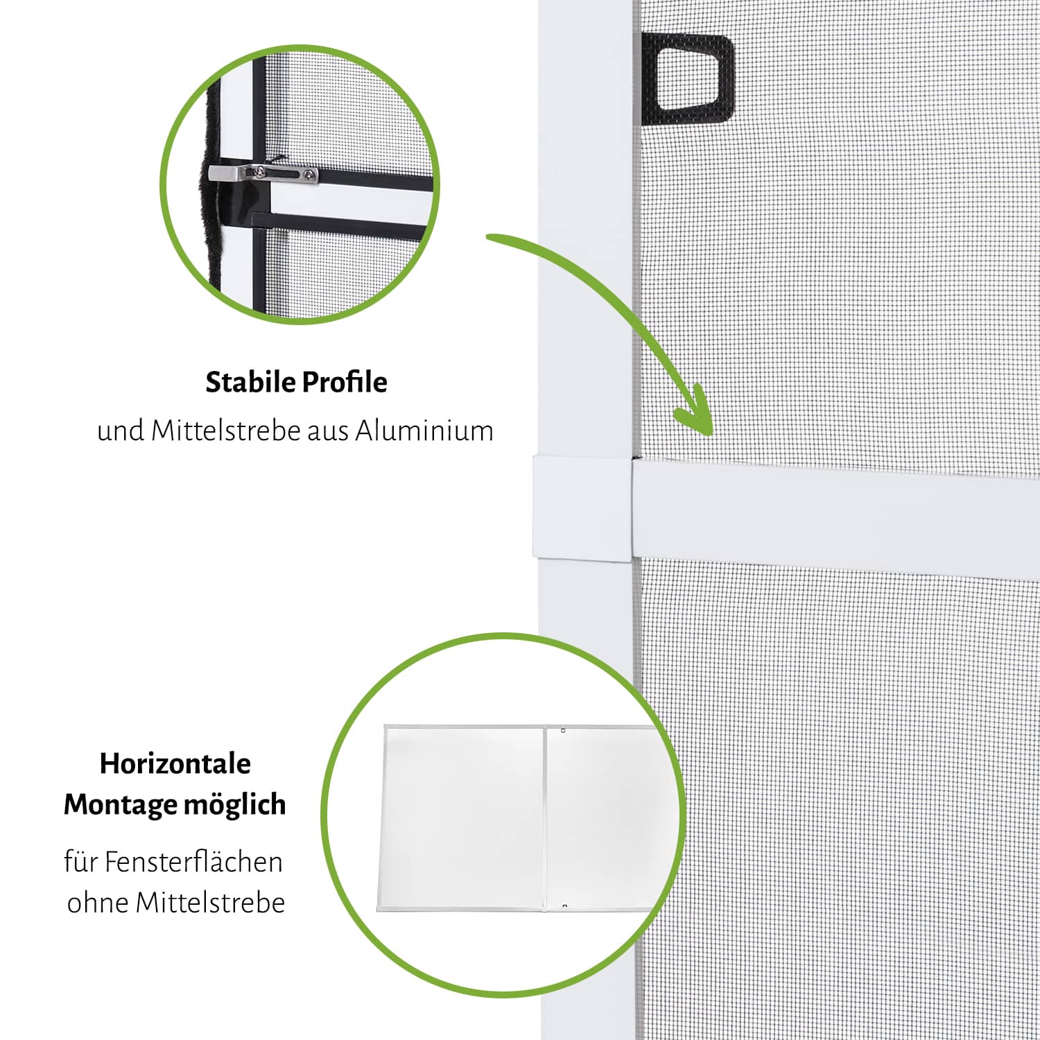 Stabiler Alu-Rahmen, Montage ohne Bohren, Horizontal montierbar, Für besonders große Fenster durch Mittelstrebe.