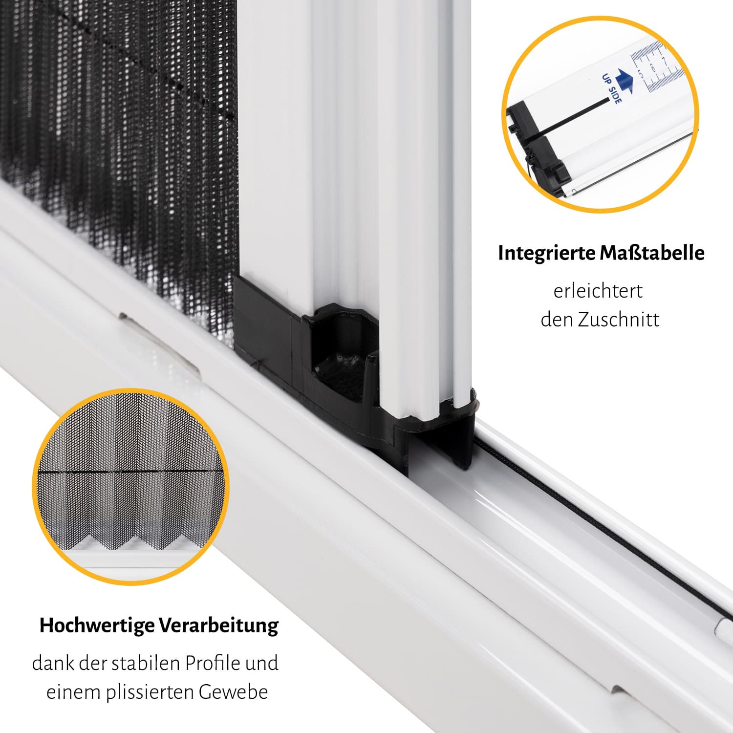 Die hochwertige Fliegengittertür mit Plissee und Aluminiumrahmen schützt dich effektiv vor störenden Insekten. Der elegante Plissee-Mechanismus lässt sich leicht bedienen und sorgt für eine stilvolle Optik. Der robuste Aluminiumrahmen garantiert Langlebigkeit und Stabilität. Die Anbringung ist kinderleicht und der Bausatz lässt sich beliebig kürzen - er kann daher an fast jedem Türrahmen angebracht werden. Die praktische Insektenschutztür kann außerdem nach deinem individuellen Wunschmaß gefertigt bestellt werden.