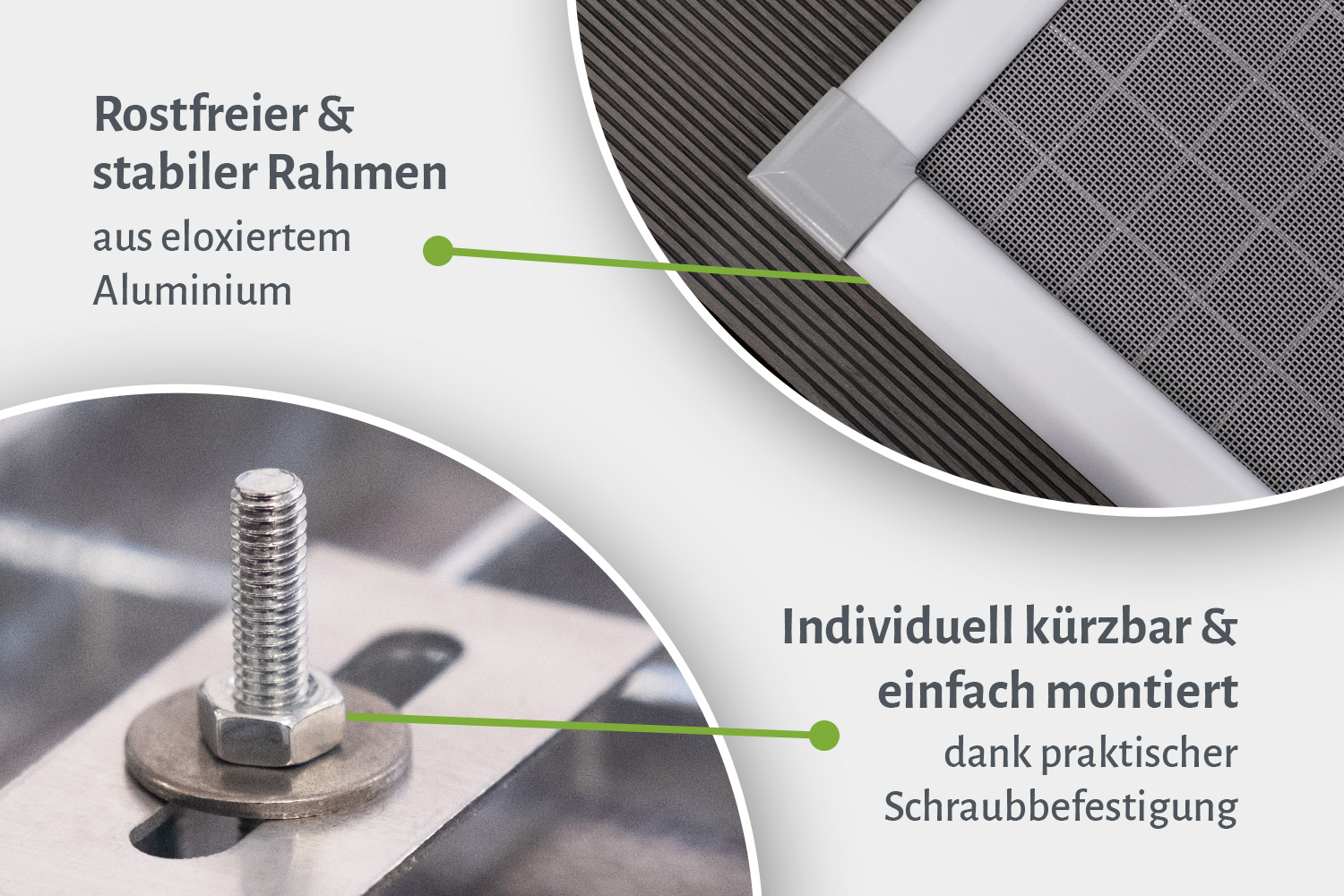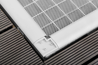 Die eloxierten Profile sind stabil und bei Bedarf individuell kürzbar. Präzise Eckverbinder sorgen für einen nahezu nahtlosen Übergang; Abdeckkappen runden den Abschluss optisch sauber ab.