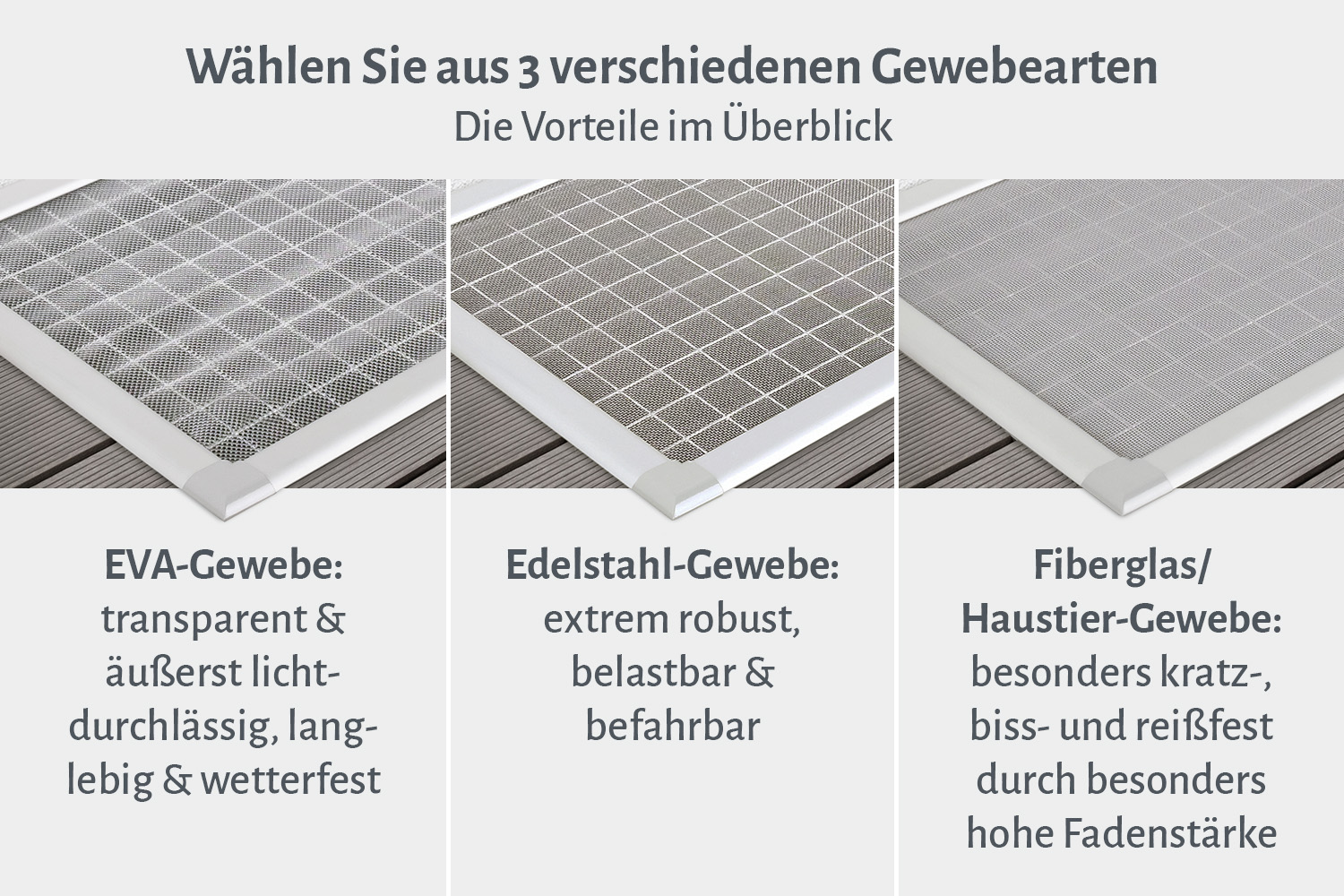 - EVA-, Edelstahl- oder Fiberglas-Gewebe