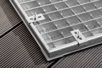 Die mitgelieferten Halterungen und Schrauben ermöglichen die schnelle Montage am vorhandenen Gitterrost – geeignet bis zu einer Lichtschachttiefe von 33 mm(nicht für festverbaute Lichtschächte).