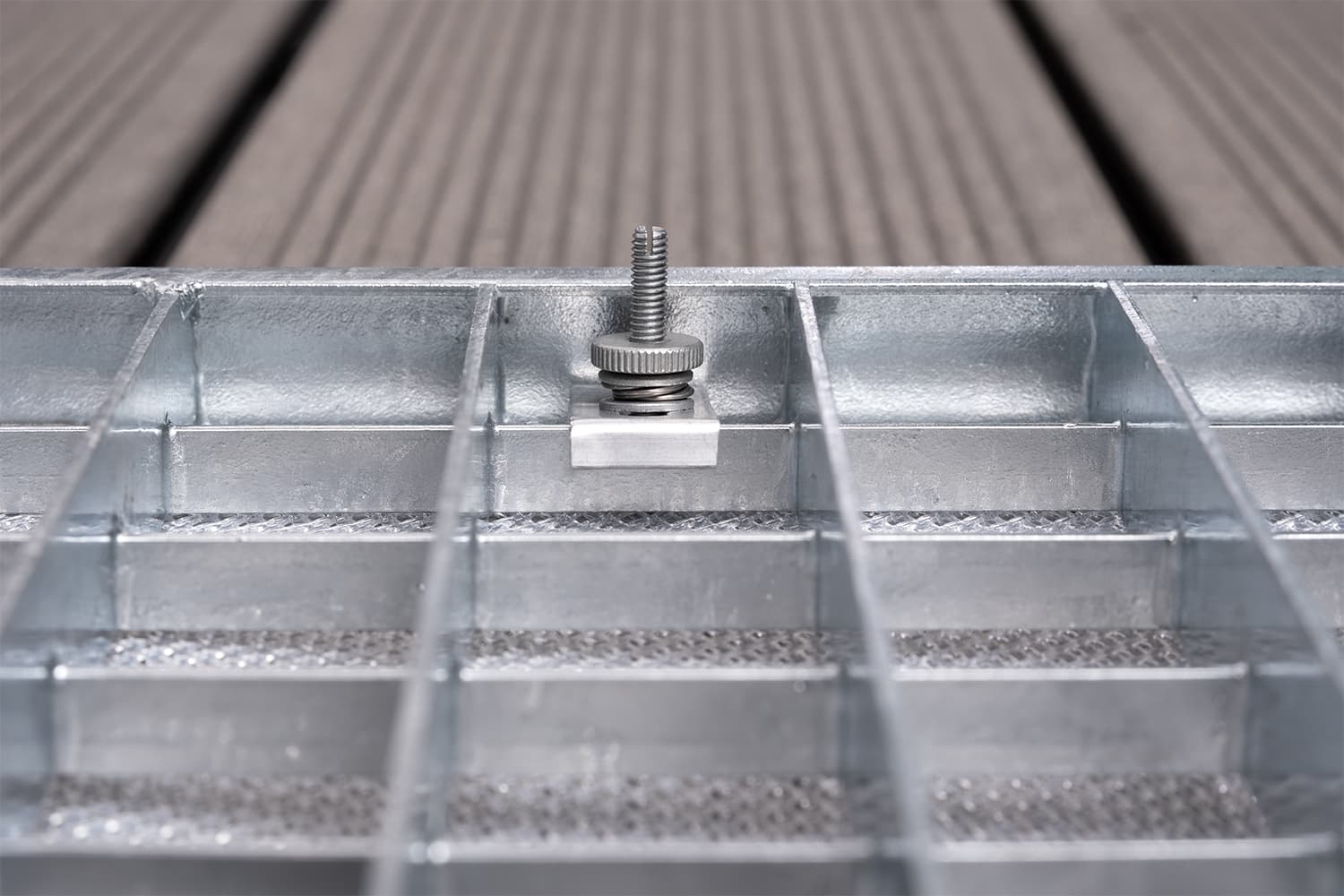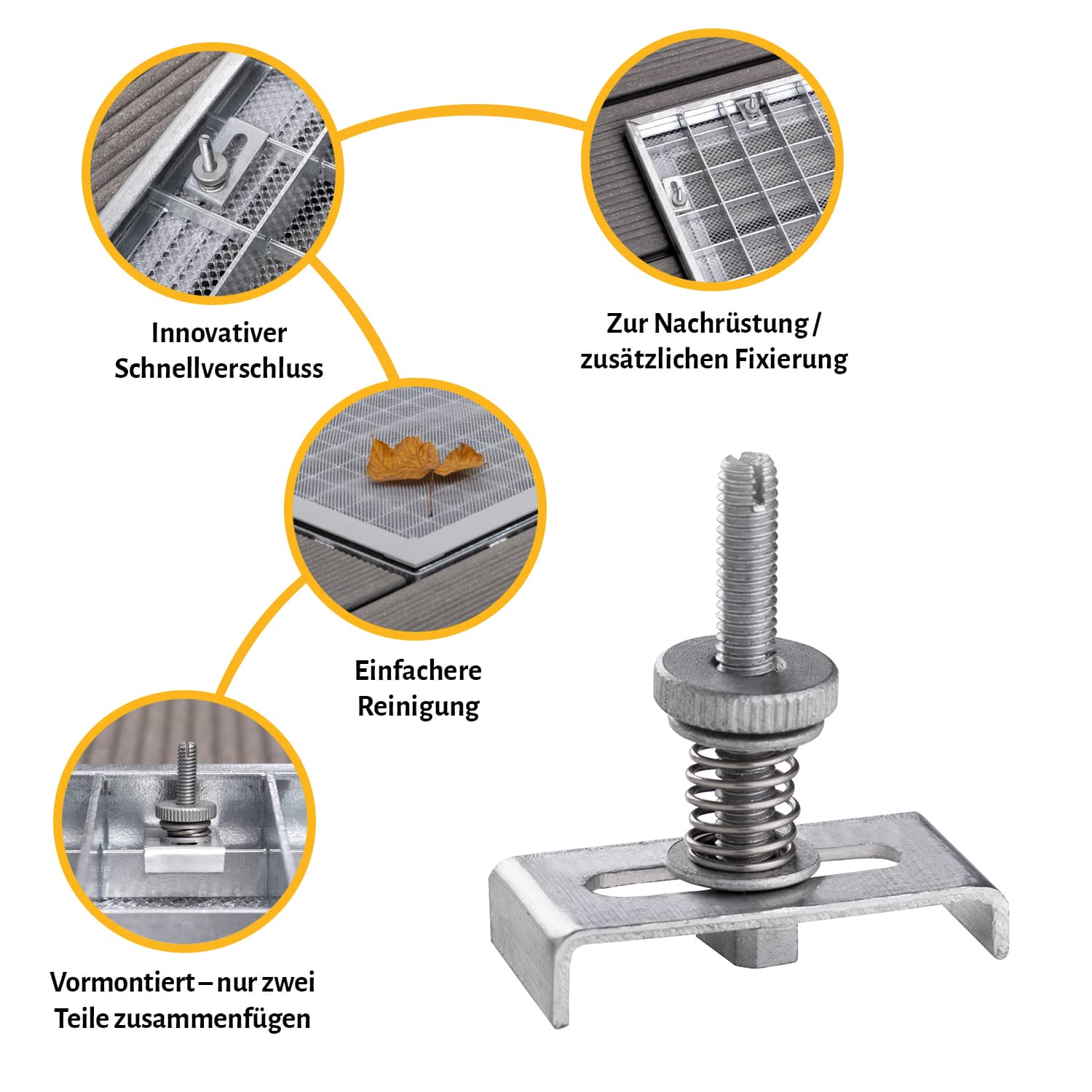 Für die Befestigung an Gitterrosten mit einer maximalen Höhe von 20 mm geeignet. Der vormontierte Schnellspanner darf nicht auseinandergebaut werden, damit eine einwandfreie Montage gewährleitet werden kann.
