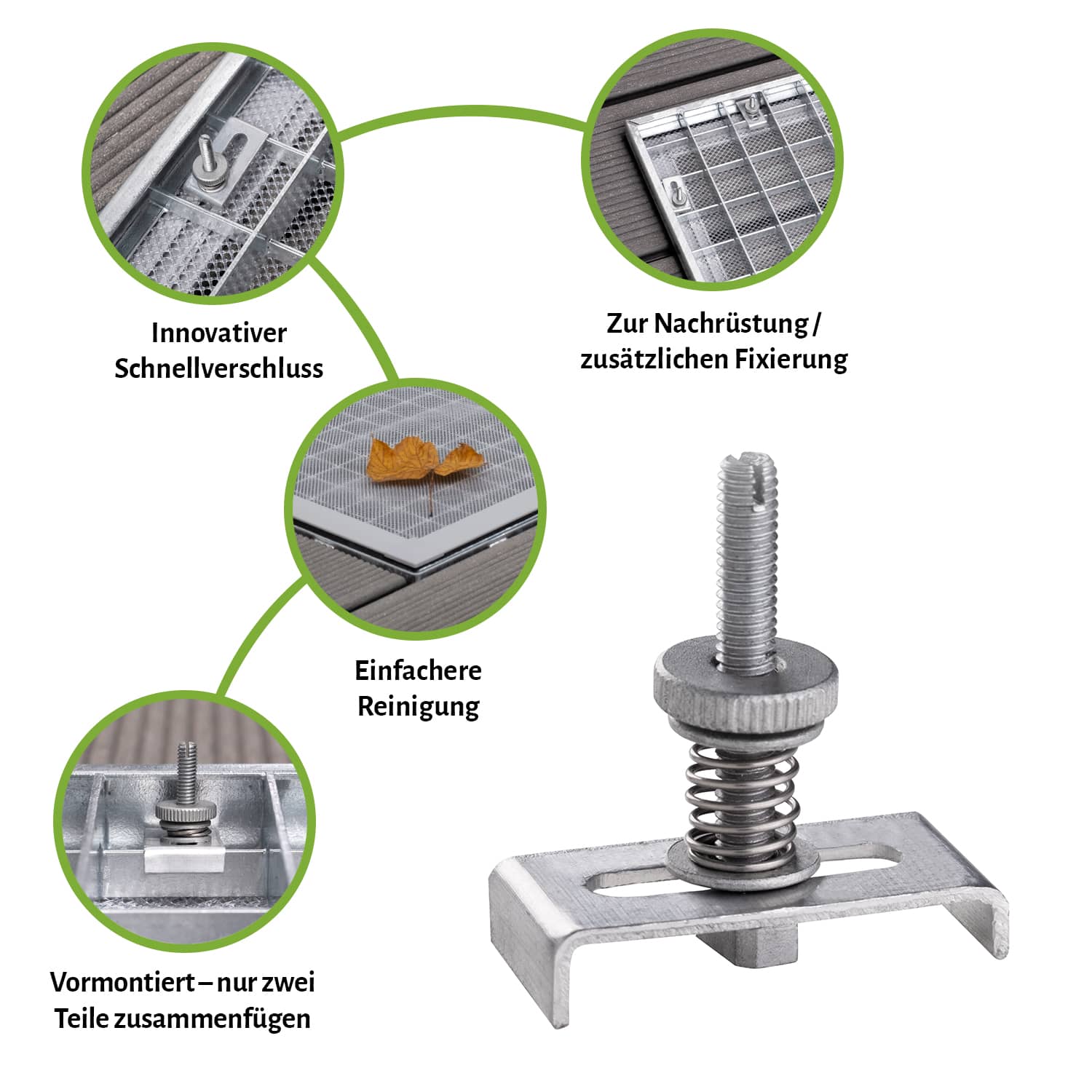 Unser innovatives Schnellverschlusssystem für Lichtschachtabdeckungen macht die Befestigung einfacher und schneller als je zuvor. Mit dem vormontierten Schnellspanner, der lediglich aus zwei zusammenzufügenden Teilen besteht, ist die Montage im Handumdrehen erledigt. Das System sorgt nicht nur für einen festen Sitz, sondern ermöglicht auch eine schnelle Demontage, was die Reinigung des Lichtschachts deutlich vereinfacht. Durch diese fortschrittliche Lösung sparst du wertvolle Zeit und kannst dich auf eine zuverlässige Befestigung verlassen.